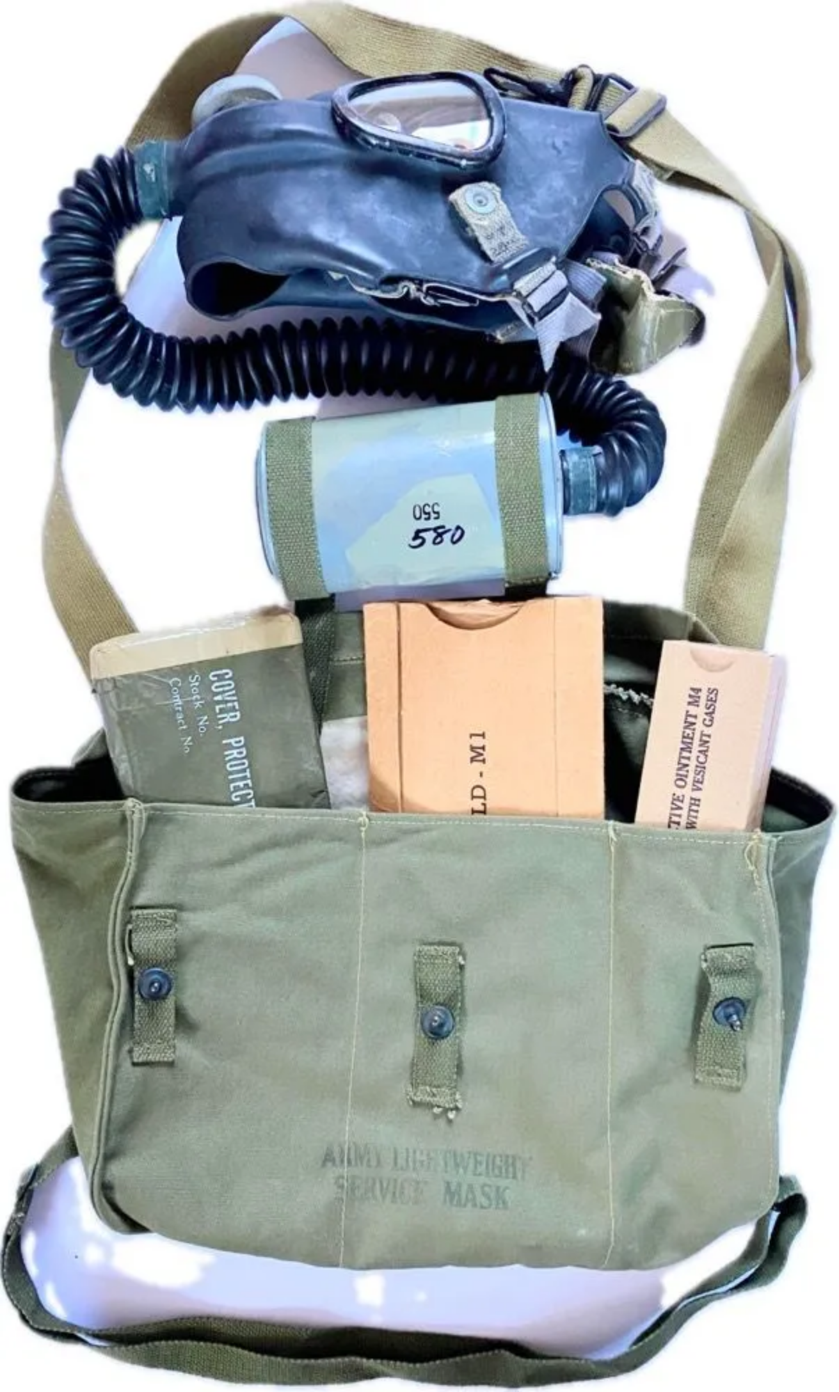 This box held a tube with ointment to neutralize vesicant gasses or sprays that got in contact with the skin. It was carried inside the bag with the new lightweight gas mask. A box of ointment was also carried inside the rubberized bag for the assault gas mask used on D-day.