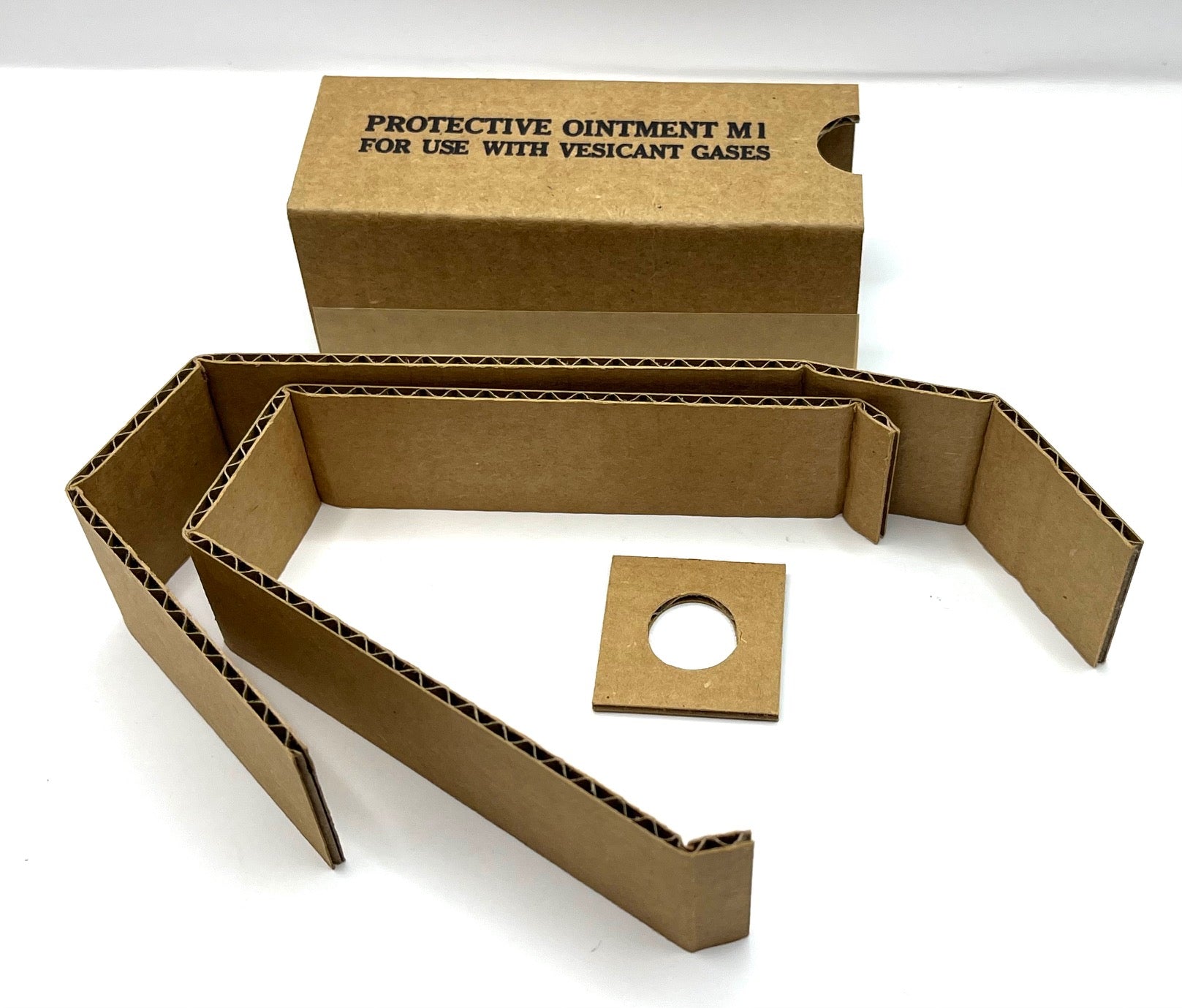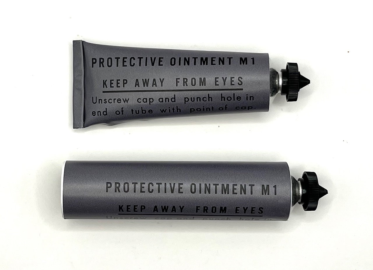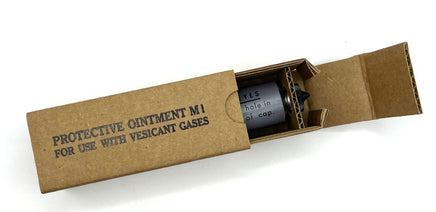 This box held a tube with ointment to neutralize vesicant gasses or sprays that got in contact with the skin. It was carried inside the bag with the new lightweight gas mask. The M1 Protective ointment was phased out in 1942 and replace with the M4 Protective ointment .