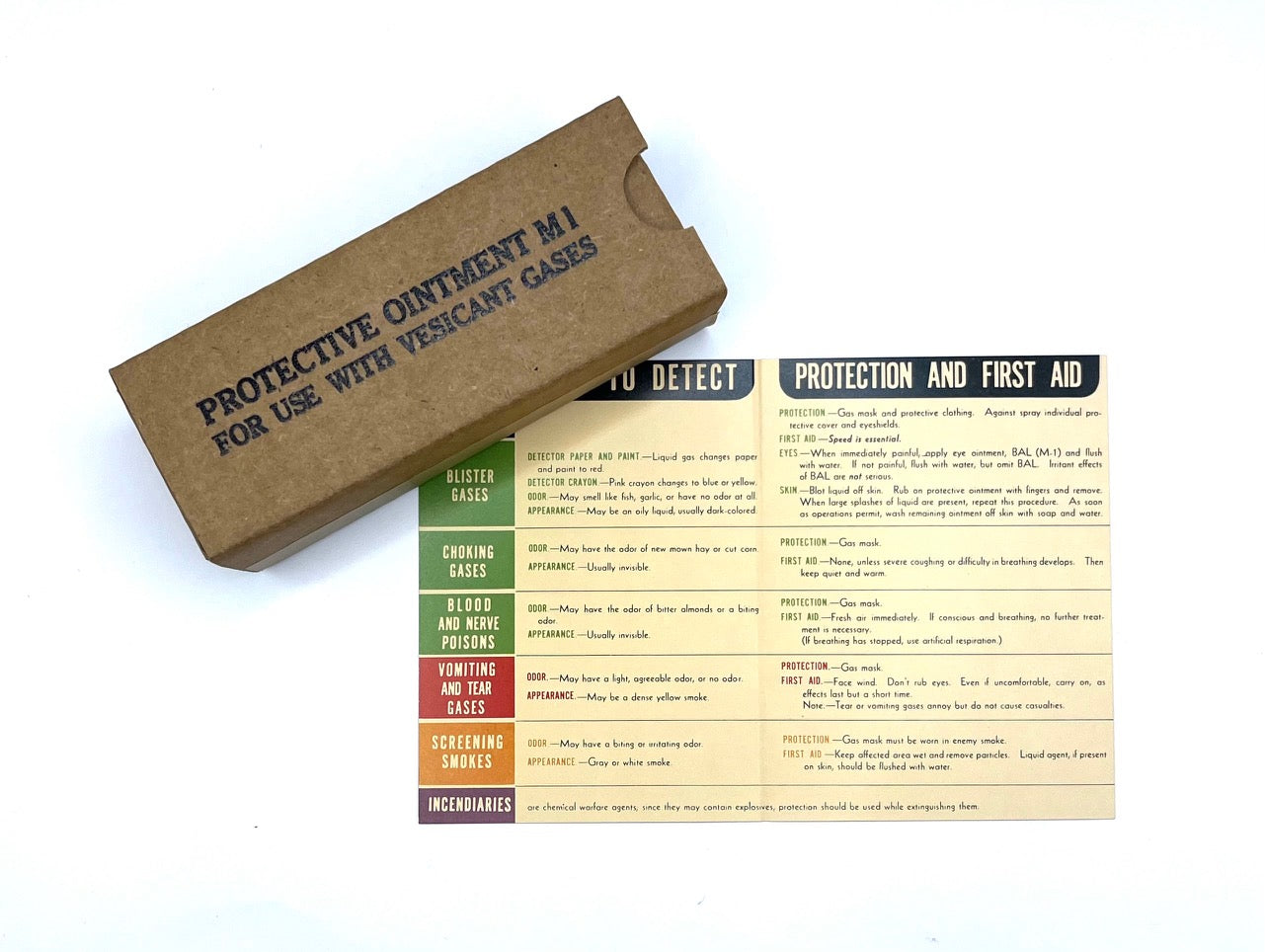Reproduction WW2 M1 Protective Ointment Box, Tube and Gas Detection Pamphlet.